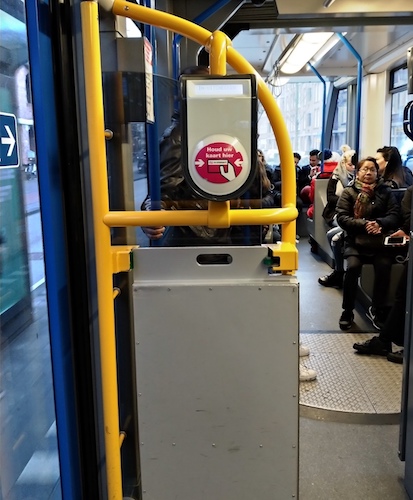 像是在路邊或路中的站牌等車、上下車要刷卡、下車要按鈴提醒司機等等。由於不是每一段列車都有人要下車,開門時是要乘客自己按門鈕推開門,只有關門是自動的(不過荷蘭人知道所以他們會推,只要跟著下車就好了)。